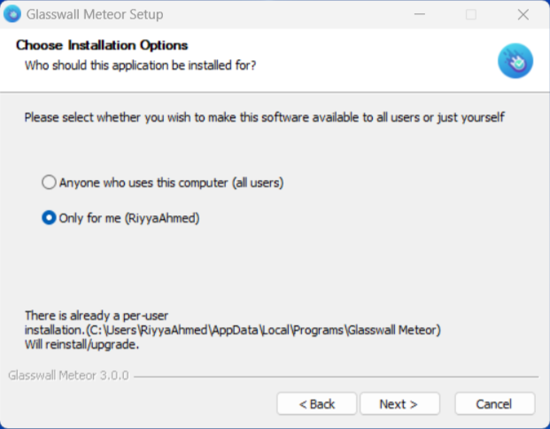 - When the dialog box displays, select the type of installation required (all users or the current user) and click Next >.