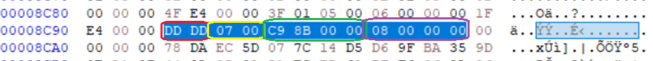 Image 68 – Custom block header (yellow) with 0x40 content size (green) containing PDF header and XObject parameters (purple)