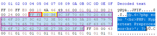 From the example above, we have embedded a PHP script in the PNG file under two different tEXt chunks. The first chunk is located just after the IHDR section and ends with the multi-line comment start symbol “/”. The second comment is located just before the IDAT block and consists of the multi-line comment end symbol “/” and the closing of the PHP block. Essentially, this achieves the commenting out of all the other binary and metadata of the primary image file, which can potentially cause PHP interpreter issues. Running this file results in the correct echo printout using php.exe with only minor errors after the execution of the block we specified. It is worth noting that in most cases with script injection the interpreter will throw exceptions, however if the primary action/purpose is achieved, the script deployment can be deemed a success.
