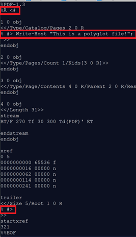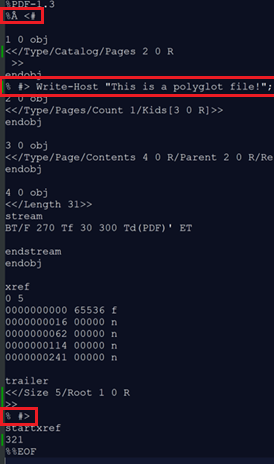 Image 57 – TXT embedded uncompressed in PDF; script content can be executed from embedded content clear code with comment block value added to beginning of file. Create PDF-PS1 polyglot