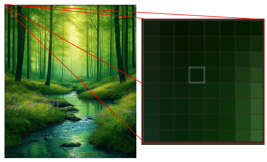 Image 7 – JPEG image of woodland, AI generated. Pixel grid 8x8 from location (0,0).